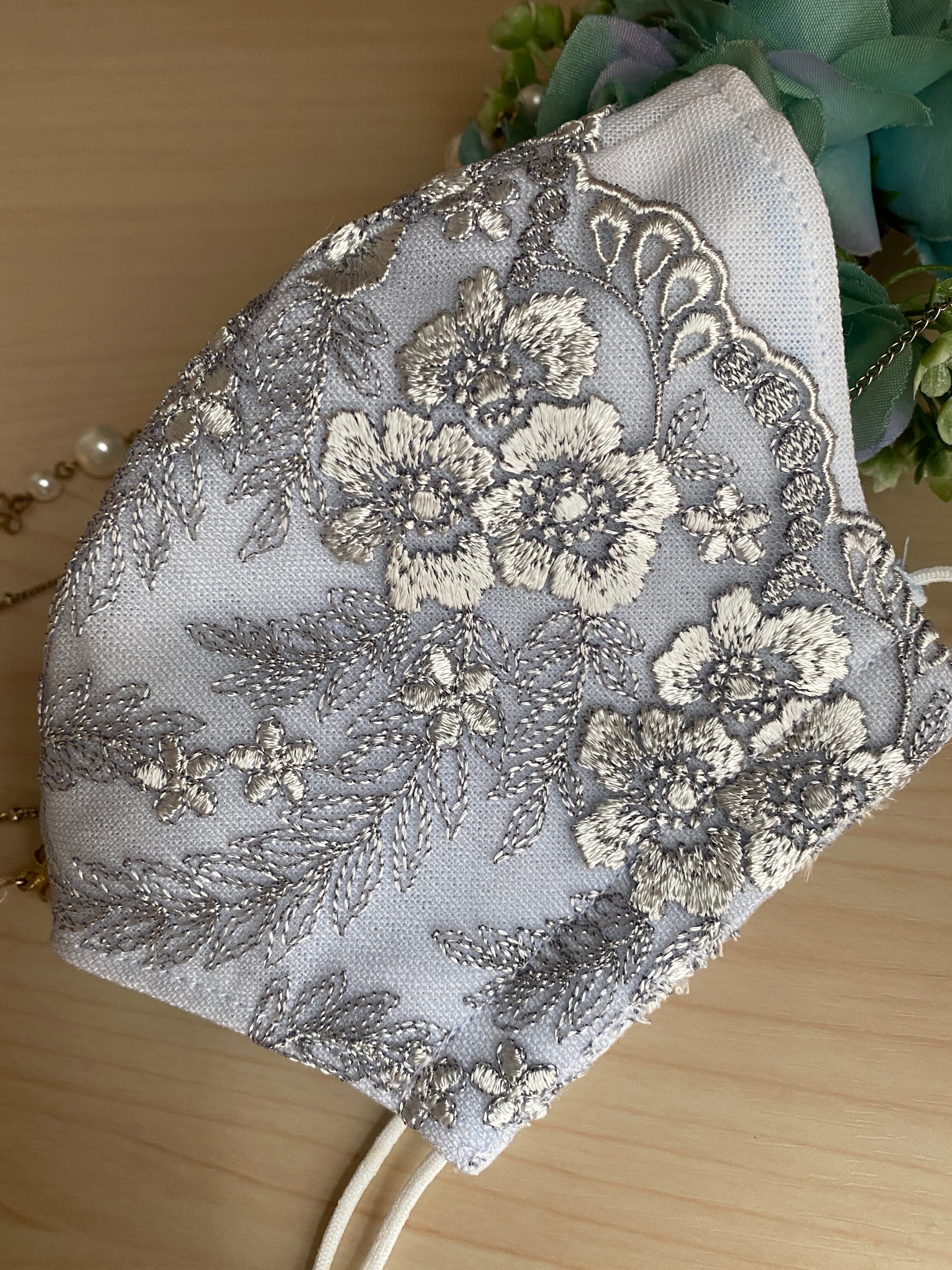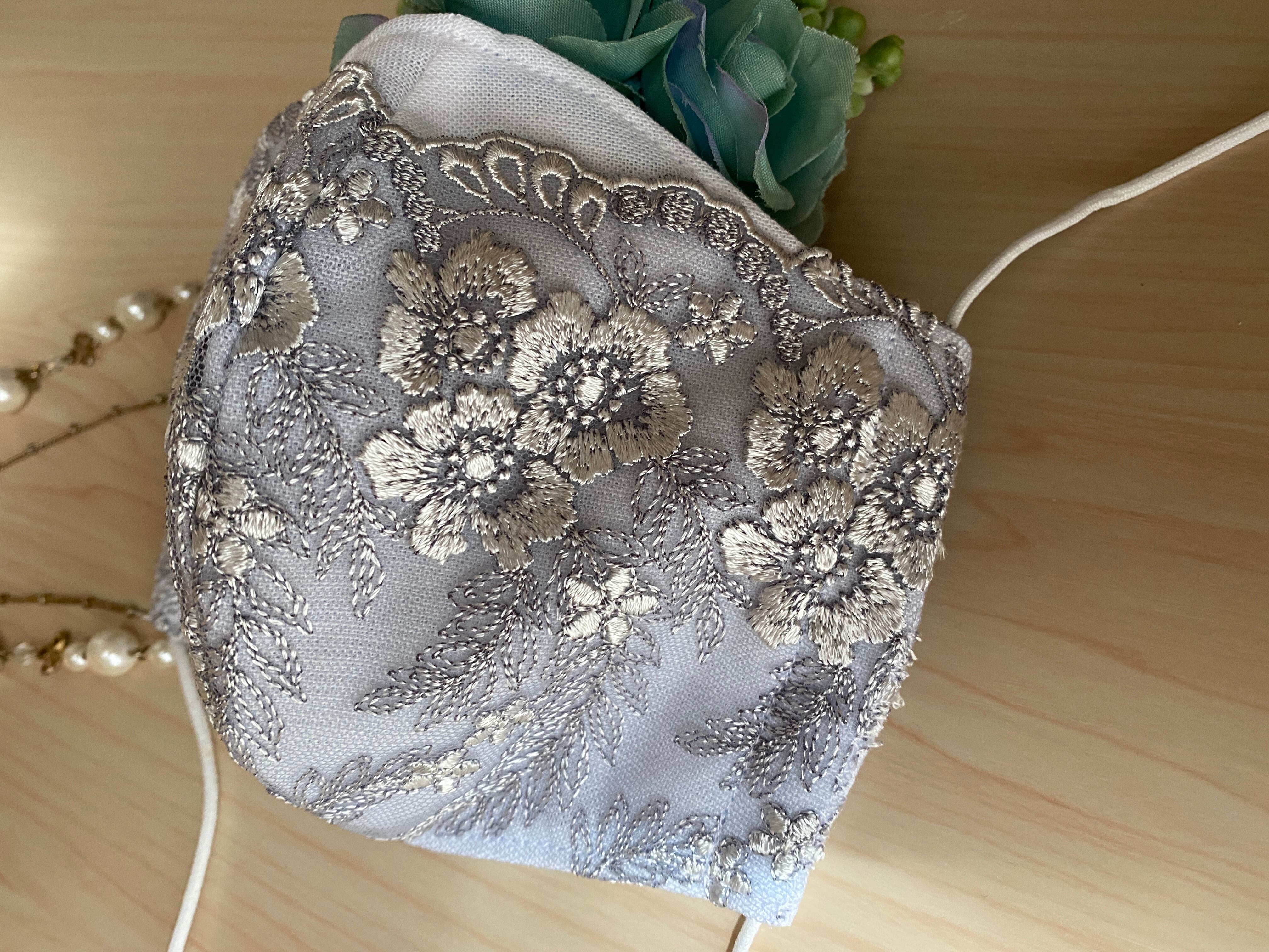 ラスト1点!冷感メッシュ!息しやすい!シルバーグレーの輝く刺繍入り 上品夏マスク