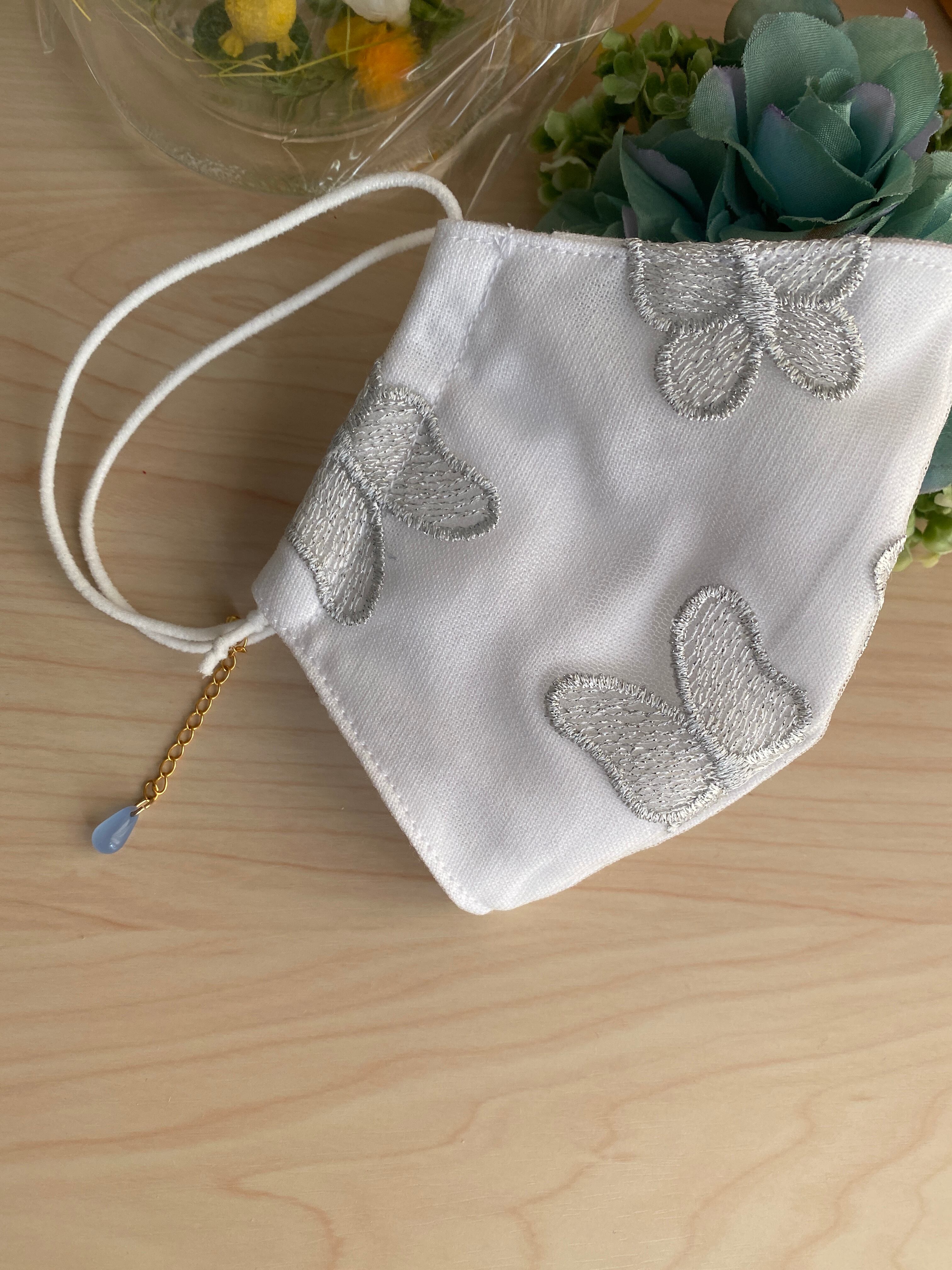 蝶柄のシルバーブライダルレース使用のマスクになります。